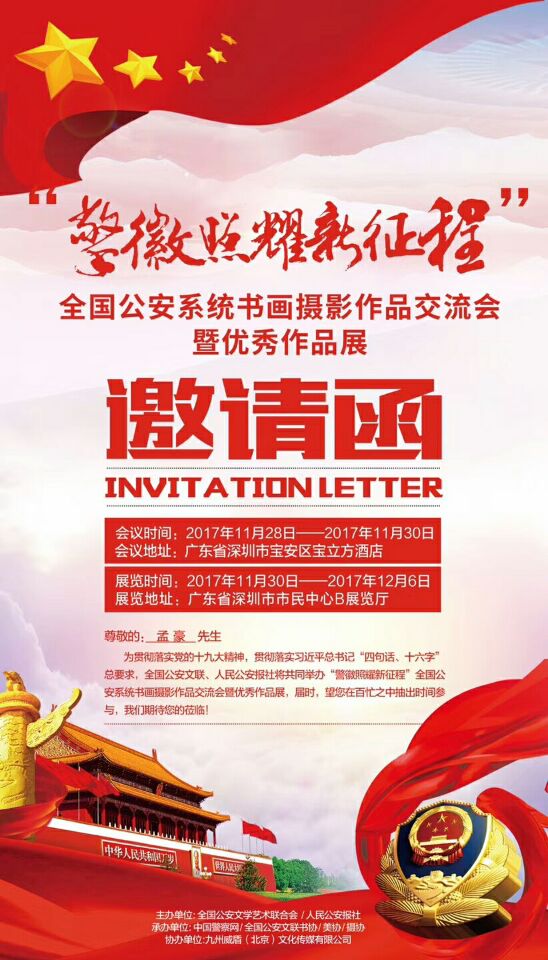 為推動(dòng)全國(guó)公安機(jī)關(guān)“迎接十九大忠誠(chéng)保平安”主題活動(dòng)的深入開展,營(yíng)造喜迎黨的十九大的良好氛圍,教育引導(dǎo)廣大公安民警忠誠(chéng)履行職責(zé)使命,以更加飽滿的熱情、昂揚(yáng)的斗志為黨的十九大勝利召開創(chuàng)造安全穩(wěn)定的政治社會(huì)環(huán)境,公安部宣傳局與部直屬機(jī)關(guān)黨委、全國(guó)公安文聯(lián)、廣東守門神集團(tuán)等單位、企業(yè)聯(lián)合將舉辦全國(guó)公安系統(tǒng)“迎接十九大忠誠(chéng)保平安”主題書畫作品展。為辦好此次書畫作品展,現(xiàn)面向全國(guó)公安機(jī)關(guān)征集主題書畫作品。
