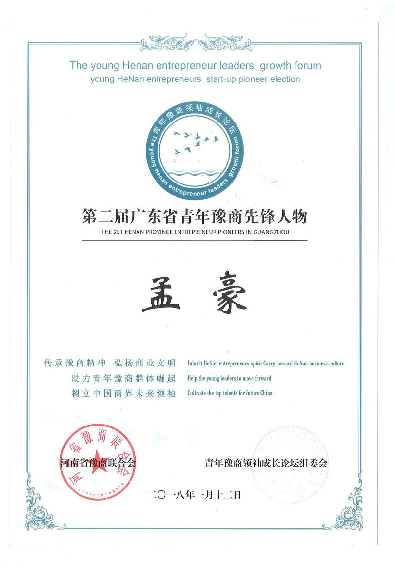 守門神科技集團有限公司董事長孟昊燃(曾用名:孟豪),此次活動中被評選為第二屆廣東省青年豫商先鋒人物,在此之前孟豪還獲得過第17屆河南省青年五四獎?wù)?、第五屆駐馬店青年五四獎?wù)隆?014年東莞十大好人等榮譽稱號。