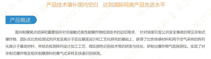 面向制爆窩點(diǎn)偵探和重要場(chǎng)所對(duì)非接觸式高性能爆炸物檢測(cè)技術(shù)的迫切需求,針對(duì)容易引發(fā)公共安全事故的常見非制式爆炸物,團(tuán)隊(duì)在比色檢測(cè)試劑開發(fā)及高分子反應(yīng)基底設(shè)計(jì)和工藝化研究的基礎(chǔ)上,獲得了比色傳感材料和用于空氣采樣的陣列化高分子基底材料,并結(jié)合檢測(cè)陣列設(shè)計(jì)加工工藝、微區(qū)顏色識(shí)別技術(shù)等的研發(fā)與優(yōu)化,研制出爆炸物氣氛探測(cè)儀。實(shí)現(xiàn)了對(duì)非制式爆炸物及相關(guān)制爆原料的集氣式采樣及快速識(shí)別探測(cè)。