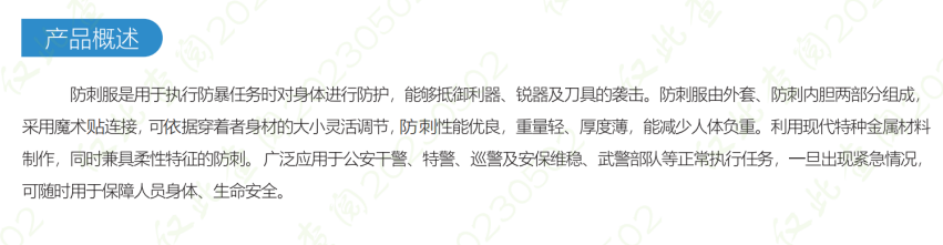 防刺服是用于執(zhí)行防暴任務(wù)時(shí)對(duì)身體進(jìn)行防護(hù),能夠抵御利器、銳器及刀具的襲擊。防刺服由外套、防刺內(nèi)膽兩部分組成,采用魔術(shù)貼連接,可依據(jù)穿著者身材的大小靈活調(diào)節(jié),防刺性能優(yōu)良,重量輕、厚度薄,能減少人體負(fù)重。利用現(xiàn)代特種金屬材料制作,同時(shí)兼具柔性特征的防刺。廣泛應(yīng)用于公安干警、特警、巡警及安保維穩(wěn)、武警部隊(duì)等正常執(zhí)行任務(wù),一旦出現(xiàn)緊急情況,可隨時(shí)用于保障人員身體、生命安全。